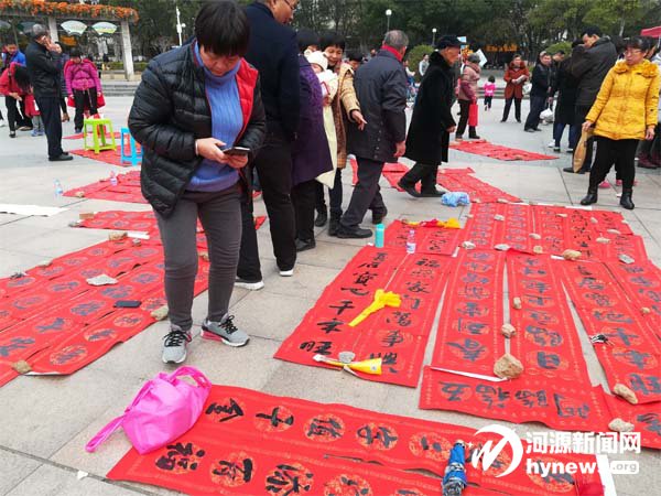 現(xiàn)場市民人數(shù)太多,書法家們彎腰奮戰(zhàn)了3個多小時,累得腰酸背痛,但他們卻說自己是“累在身上、樂在心中”。中書協(xié)會員、省書協(xié)會員、市書協(xié)常務(wù)副主席王永剛表示,每年新春佳節(jié)來臨之際,正是書法家們發(fā)揮所長、與眾同樂的時候,能盡自己的力量為大家做點事,他心里很高興。“藝術(shù)從人民中來,要到人民中去,為人民服務(wù)。河源市書協(xié)多年來一直堅持這樣做,每年舉辦數(shù)十場送春聯(lián)活動,進社區(qū)、下鄉(xiāng)村,特別是近年來,越來越多的書法家和書法愛好者參與進來。”