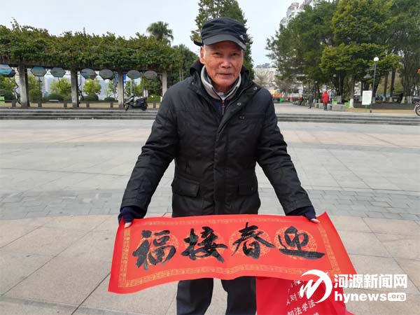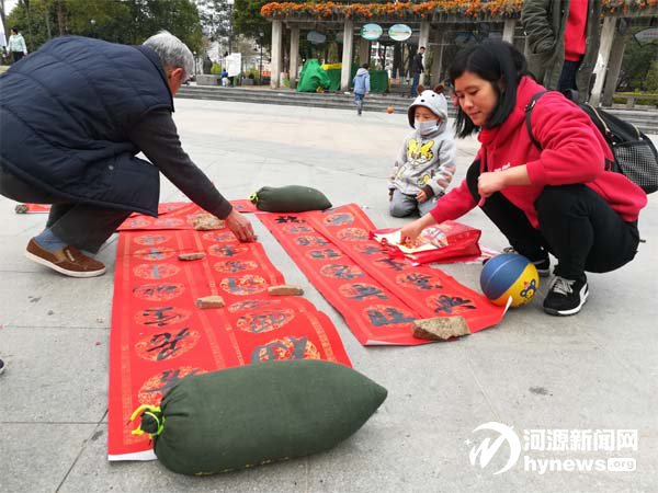 劉阿姨老家重慶,隨女兒在河源居住8年多時間了。今天一如往日,她與幾個老伙伴一起在茶山公園跳扇舞,也湊了一把寫春聯(lián)的熱鬧。只見她的春聯(lián)上壓著自己的一個手提包、兩把跳舞用的扇子,“這活動辦得好,便民惠民,除了春聯(lián),我剛剛還領(lǐng)了利是袋,不用再去操心了。希望你們明年還來辦活動,辦得紅紅火火!”