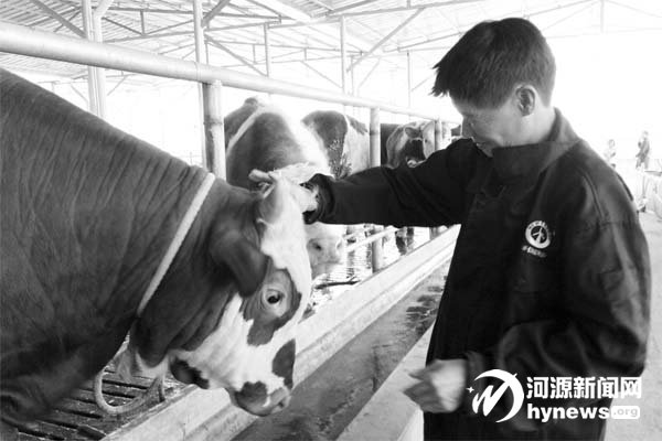 每天一吃過早飯,龍川縣老 隆鎮聯新村貧困戶曾得初就騎著 自行車,來到位于村白墩小組半 徑口的西門達爾肉牛養殖場照顧 他的“寶貝們”——150 頭西門達 爾肉牛,清潔、喂料,做得一絲不 茍。空閑時間,他還進行牛體刷 拭,保持肉牛身體清潔。
