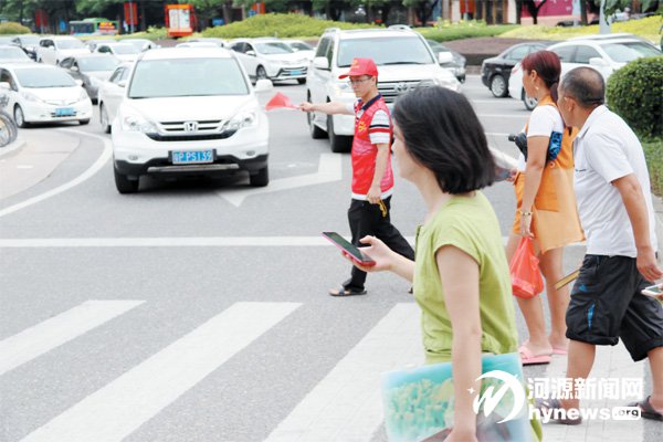 記者在鄒丹執(zhí)勤的路口看到,這個路口車流量非常大,而且附近還有商場和居民小區(qū),行人特別多。從上月1號起,經(jīng)過這個路口的市民都會看到,每天早晚上下班高峰時,志愿者們都會按時站在崗位上,舉旗吹哨指引著行人通過這一路段。
