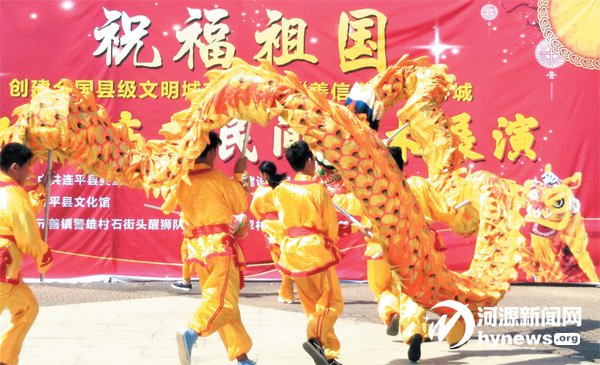 1日,連平縣舉辦的祝福祖國——創(chuàng)建全國縣級文明城市·打造“善信廉”幸福心城民間藝術(shù)展演在該縣市政廣場舉行。當(dāng)?shù)卦奇?zhèn)警雄石街頭醒獅隊、田源鎮(zhèn)長翠村舞龍隊、退管會腰鼓隊等演員,以舞獅、歌唱等民間藝術(shù)表演表達對祖國的熱愛之情。