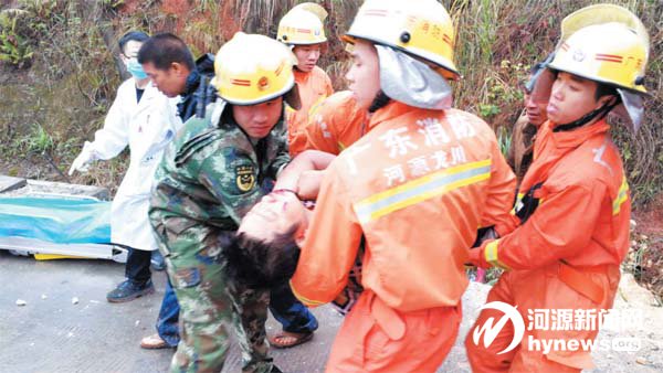 前日上午8 時(shí)許,東源 縣柳城鎮(zhèn)牛背村往河源方 向附近國(guó)道發(fā)生了一起交 通事故,一輛裝滿石頭的泥 頭車(chē)撞上路邊的坡體,貨車(chē) 車(chē)頭嚴(yán)重凹陷變形,一名司 機(jī)被困駕駛室。隨后,龍川 縣消防中隊(duì)立即趕往現(xiàn)場(chǎng) 展開(kāi)救援,通過(guò)破拆、擴(kuò)張 等方法,將司機(jī)救出。