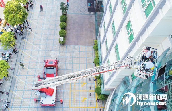 火災現場設置在邁豪國際 酒店五樓客房,兩名人員被困, 發生火災后,酒店員工避開火 源,就近疏散,消防隊員使用了 戶外消防云梯將被困人員救出 火場。經過30 分鐘左右的緊 張撲救,火災被徹底撲滅,被困 人員成功救出,演練取得了圓 滿成功。
