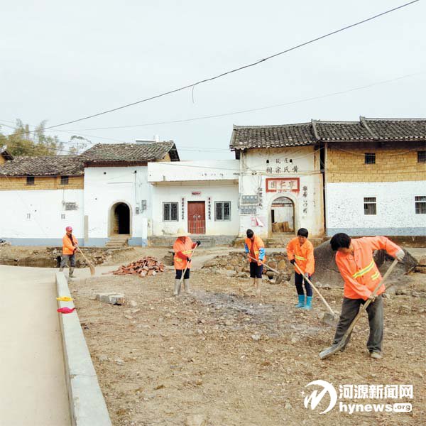蓮坑村環衛隊員在老祠堂前打掃衛生。