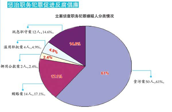 1、保持反腐敗力度不減:共立案?jìng)刹?職務(wù)犯罪案件70 件82 人,挽回經(jīng)濟(jì)損失 2000多萬(wàn)元。