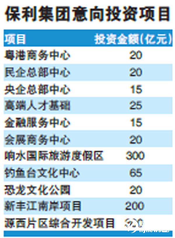 此次雙方簽訂戰(zhàn)略合作框架協(xié) 議,保利集團(tuán)將結(jié)合河源未來(lái)城市發(fā) 展需要,充分利用河源生態(tài)、資源、 區(qū)位等優(yōu)勢(shì)以及自身在建筑、房地 產(chǎn)、民用爆破、文化藝術(shù)和金融等方 面的優(yōu)勢(shì),在基礎(chǔ)設(shè)施、市政配套、 旅游、文化、民生等領(lǐng)域進(jìn)行緊密合 作,促進(jìn)河源經(jīng)濟(jì)與社會(huì)的快速發(fā) 展,預(yù)計(jì)雙方合作投資規(guī)模約1000 億元。目前,雙方正在對(duì)接的具體項(xiàng) 目有11 個(gè),涉及粵港商務(wù)中心、民企 總部中心、央企總部中心、高端人才 基地等。