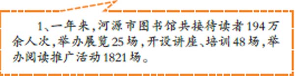 自開館以來(lái),市圖書館新館先 后推出了“書香河源”全民閱讀活 動(dòng)、“微家書”“優(yōu)閱故事會(huì)”“中華文 化我傳承”、好書分享等系列活動(dòng), 活動(dòng)內(nèi)容和形式豐富多彩,公眾參 與面越來(lái)越廣,社會(huì)影響力越來(lái)越 大。一年來(lái),該館共接待讀者194 萬(wàn) 余人次,舉辦展覽25 場(chǎng),開設(shè)講座、 培訓(xùn)48 場(chǎng),舉辦閱讀推廣活動(dòng)1821 場(chǎng),對(duì)“書香河源”氛圍的營(yíng)造起到 了積極的推動(dòng)作用。