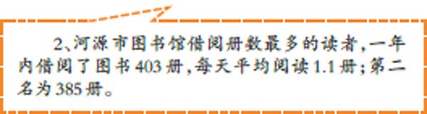 “讀書是增長(zhǎng)知識(shí)的途徑,現(xiàn)在 不再是靠關(guān)系生存的年代,人不進(jìn) 則退,保持終生學(xué)習(xí)的態(tài)度才不會(huì) 被社會(huì)淘汰。”作為2017 年“借閱之 星”之一,今年46 歲的賴傳斌一年中 借閱了137 冊(cè)圖書。他說(shuō)自己平時(shí) 沒什么其他愛好,唯一的興趣就是 讀書。據(jù)統(tǒng)計(jì),市圖書館借閱冊(cè)數(shù) 最多的讀者,一年內(nèi)借閱了圖書403 冊(cè),每天平均閱讀1.1 冊(cè);第二名為 385冊(cè)。