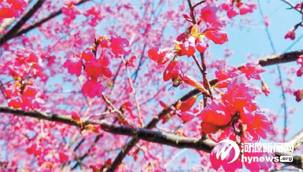 藍(lán)天白云下,櫻花朵朵開。 在和平縣青州鎮(zhèn)金穩(wěn)有機(jī)茶場(chǎng), 沿著茶場(chǎng)種植的櫻花已經(jīng)陸續(xù) 盛開,櫻花萬點(diǎn)紅的景象在青枝 綠葉的茶園間顯得格外艷麗,引 來不少愛花的游客前往觀賞。
