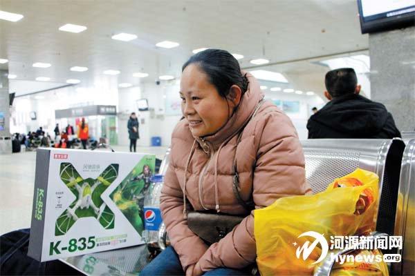 在河源火車站候車廳,記者遇到 了回湖北老家的一對夫妻,他們身旁 擺著3大袋滿滿當當的行李,顯得很 是笨重,而其中一個用綠盒子裝的無 人機格外引人注目,這架無人機是胡 海燕準備帶回家給兒子的禮物。