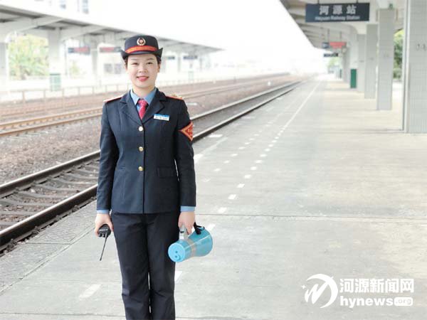 在河源火車站擁擠的人潮中,客運 值班員龍娟堅守崗位,淡定從容面對繁 雜的工作。