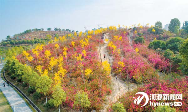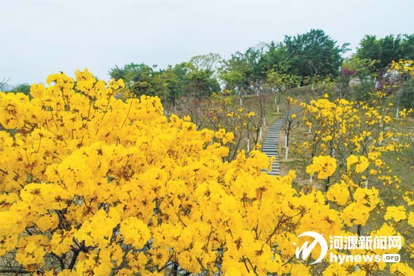 連日來,本報記者走訪了市區(qū)多個路段及 部分公園發(fā)現(xiàn),在市區(qū)客家文化公園的小山坡 上,這里的黃花風鈴木正開著鮮艷的花朵,風一 吹,漏斗狀的花瓣隨風飄落,散落一地,像是給 公園鋪上了金黃的地毯。在市花簕杜鵑的襯 托下,花團錦簇的黃花風鈴木顯得更加特別。