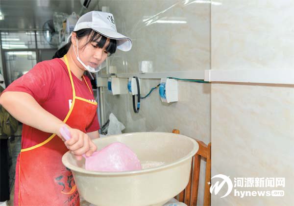 21 年前,老家在新豐江水庫一 帶的珍姨帶著一家人來到市區(qū)討生 活,從挑著擔(dān)子走街串巷,到推著三 輪車沿街?jǐn)[賣,再到現(xiàn)在有固定門 面,珍姨早餐在東埔一帶遠(yuǎn)近聞 名。很多到他鄉(xiāng)工作的、嫁到外地 的、一家人搬走的老顧客,每到清明 時,都會向珍姨訂制艾粄。說到做粄 的初衷,珍姨這樣說:“這是祖宗傳下 來的,以前只要是農(nóng)村人都會做。”