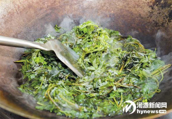 將茶籽殼等裝進(jìn)布袋里,放入 水中,熬煮,就是可以去除艾草苦 澀味的“灰水”了。把采摘下來的 新鮮艾草放入煮沸的“灰水”中煮 軟,再撈起來瀝干水,放到砧板上 用菜刀剁碎。劉麗莎特別提道: “煮艾草的時候不要蓋上蓋子,否 則艾草會變黃,就不夠鮮亮好看 了。”剁碎的艾草還要再加水煮熱, 按照一比一的量,趁熱與純正的糯 米粉和成青團(tuán)。在和粉團(tuán)的時候, 適當(dāng)加一點(diǎn)食用油和白砂糖,食用 油可以使青團(tuán)更嫩滑、不粘手,而 白砂糖可以減輕艾草的澀感。“在 這個過程中,水量是最關(guān)鍵的,盡 量一步到位。揉成的青團(tuán),一小團(tuán) 放在板上,要不會塌下去,而壓扁 后邊邊不會裂開,這就說明軟硬度 合適了。”