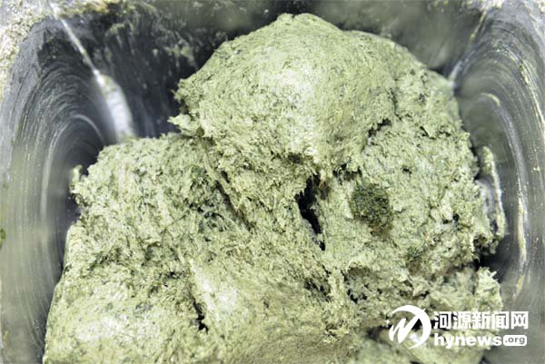 煮熟的艾葉剁碎后,與糯米粉和均勻。