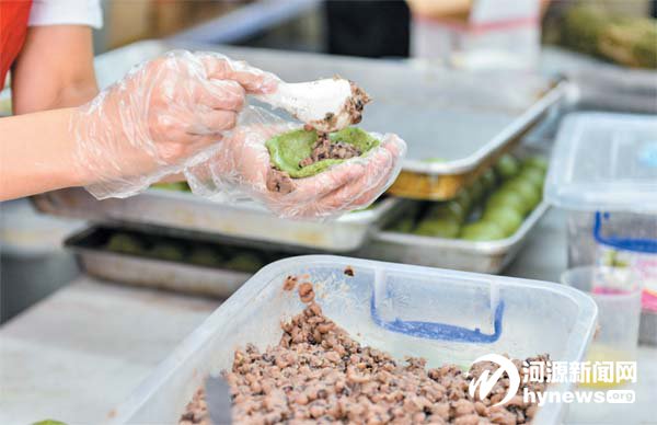 蓮紀(jì)艾粄的口味有四種,分別 是芝麻花生餡、冰糖花生餡、咸香眉 豆餡以及無餡的純艾粄,根據(jù)個人 口味和需求來選擇餡料。花生和芝 麻都要炒香、碾碎,花生還要去皮, 而眉豆加鹽在高壓鍋里煮到綿軟。 在完成各種準(zhǔn)備工作后,劉麗莎就 和工人們一起制作艾粄了。她們將 青團(tuán)分成均勻的一個個,用手心壓 成扁圓狀,放一白瓷勺的餡料進(jìn)粉 皮中,再包起來。做好的艾粄放進(jìn) 蒸爐里,15 分鐘就出爐了。新鮮出 爐的艾粄,色澤墨綠,散發(fā)出一股濃 濃的清香,令人垂涎。