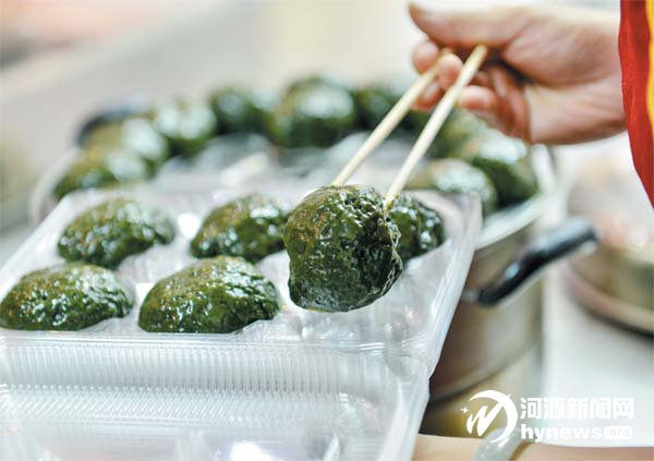 晚上8 時,位于源城區(qū)東埔市 場內(nèi)的珍姨早餐店內(nèi)就亮起了燈 光,江雪珍和丈夫、女兒開始制作 艾粄。珍姨的艾草是自己到老 家、埔前等地摘來的,為了應(yīng)對清 明期間的艾粄需求,她摘來了幾 百斤艾草。“每天數(shù)量不定的,很 多是熟客預(yù)訂的,在預(yù)訂基礎(chǔ)上 再加做兩三百個來散賣。”珍姨告 訴記者,前一天給北京的客人寄 去了上百個,而這天晚上做的幾 百個里,其中有200 個是要寄到東 莞去的。“客家人不管去到哪,清 明的時候都要吃艾粄的。”珍姨的 丈夫江少軍說道。