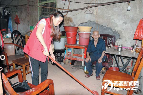 看到陳小麗的到來,家住源城區 上城街道更樓下巷附近的李育耀老 人高興得合不攏嘴,連忙招呼陳小麗 進屋坐下。而陳小麗進門后卻立即 拿起了掃帚,開始為老人打掃房間。 李育耀今年已經84 歲了,提起親人, 他只是默默地指了指墻上父母的照 片,10 多年前母親去世,他便失去了 唯一的親人。“要不是阿妹每天來照 顧我,什么都給我做,我還真不知道 自己的日子會過成什么樣子。”老人 說,陳小麗就像自己的女兒一樣,每 天都會過來幫自己打掃衛生、洗衣買 菜、劈柴做飯。