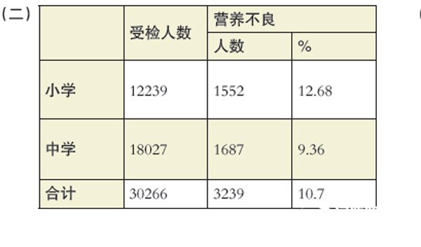根據(jù)統(tǒng)計(jì),此次參加檢查的人 數(shù)共有30266 人,其中小學(xué)有12239 人,中學(xué)有18027 人;營(yíng)養(yǎng)不良的學(xué) 生共有3239 人,其中小學(xué)生的問(wèn)題 較為嚴(yán)重,約有1552 人營(yíng)養(yǎng)不良, 占比達(dá)到12.68。