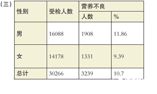 在男女性別方面,此次共有 16088 名男生,14178 名女生參加體 檢。其中男生的問(wèn)題較多,男生營(yíng)養(yǎng) 不良的約有1908人,占比11.86%。
