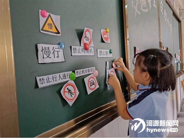 “加油!加油!……”市二小二年級(5)班傳來了熱烈的鼓勁加油聲,站在講臺上的8位學生分成4個小組,正緊張地將手上的交通標志與文字對應起來,臺下的小伙伴們也忍不住站起來想幫他們一把。原來,該班正在進行“交通標志對對碰”游戲,在老師的帶領下,學生們在游戲中知道了“禁止鳴喇叭”“禁止駛入”“慢行”等交通標志的具體含義,也將交通安全意識牢記于心。