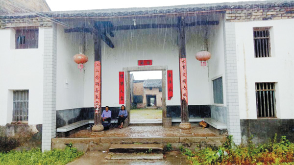 尋訪進(jìn)士碑坊所在的中心圍,不見昔日“青磚小瓦馬頭墻,回廊掛落花格窗”,庭院里點(diǎn)點(diǎn)紅色的石頭經(jīng)雨水沖刷愈顯鮮艷,有如客家先祖的血汗與榮光。老屋門口巧遇幾位村中耆者,論起家族歷史,他們也能講個(gè)一二。“以前進(jìn)士碑坊是很靚的,大門是圍墻,有石條,門口有石獅子,‘文革’時(shí)被人用鐵錘砸壞了。”一阿婆如是回憶說(shuō),一臉的惋惜。