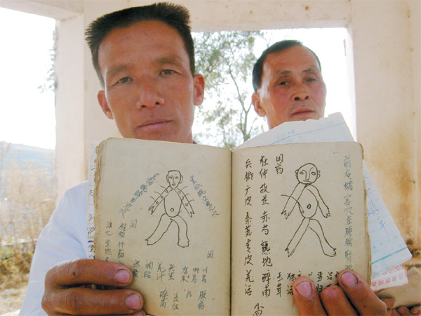和平縣武術(shù)協(xié)會相關(guān)人士說,和平民間武術(shù)有個顯著特點,那就是全縣17個鎮(zhèn),鎮(zhèn)鎮(zhèn)不一樣,村村也不盡相同。和平民間流傳的武術(shù)有“林家打”“鄧家打”“陳家打”等不少于20種。以林寨鎮(zhèn)為例,林寨烏石村的“席拳棍術(shù)”伴隨著“席床生日節(jié)”產(chǎn)生,集棍術(shù)與拳術(shù)完美結(jié)合,兩者取其長、兼其優(yōu);融合打席動作用力原理,突出打席時心到、眼到、手到、眼疾手快的特點。此外,林寨鎮(zhèn)的“陳家打”在當(dāng)?shù)匾差H有名氣,并以其絕技“黑虎掏心”最為有名。當(dāng)?shù)夭簧訇愋杖诉經(jīng)常會表演這一絕技。記者日前在林寨見到了“陳家打”的傳人陳石權(quán),他至今還保存著陳家拳譜的手抄本,上面多是“穴位歌決”,如“七吼咽喉總于天,心崗一穴同相連,臍肚受傷笑到亡,陰陽赤笑即歸仙”之類。