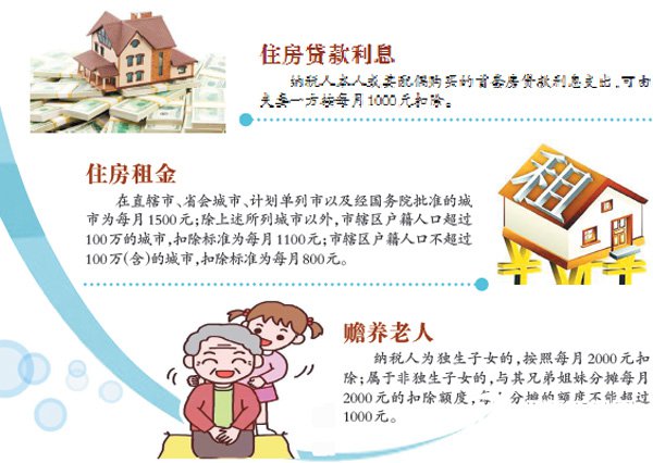 首次增加子女教育、繼續教育、大病醫療、住房貸款利息或住房租金、贍養老人等6項專項附加扣除
