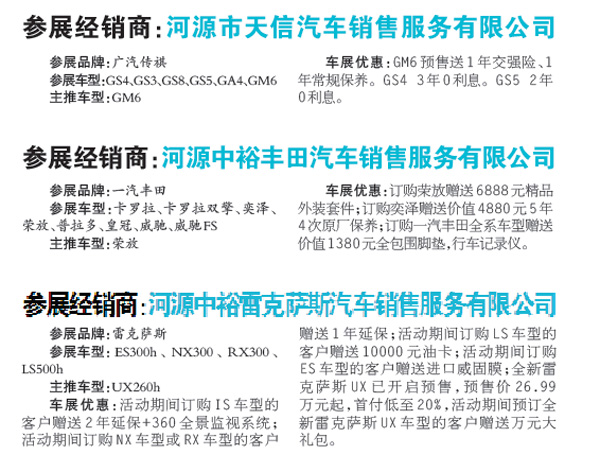 據了解,本次車展有廣汽傳祺、廣汽豐田、廣汽本田、廣汽三菱、吉利汽車、長城哈弗、一汽大眾、東風雪鐵龍、東風標致、長安馬自達、君馬汽車、雷克薩斯、一汽豐田、東風本田、長安汽車、東風風光、別克、雪佛蘭、領克、東風日產、上汽大眾、上汽榮威等品牌參與,將有近百款車型精彩亮相。
