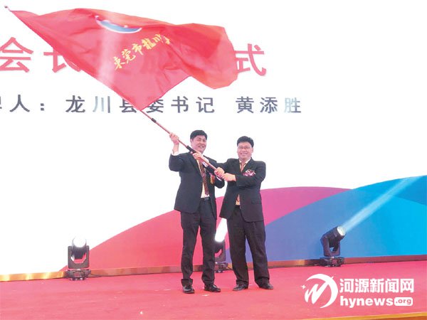 龍川縣委書記黃添勝(圖右)為東莞市龍川商會(huì)首任會(huì)長(zhǎng)黃文輝授旗。