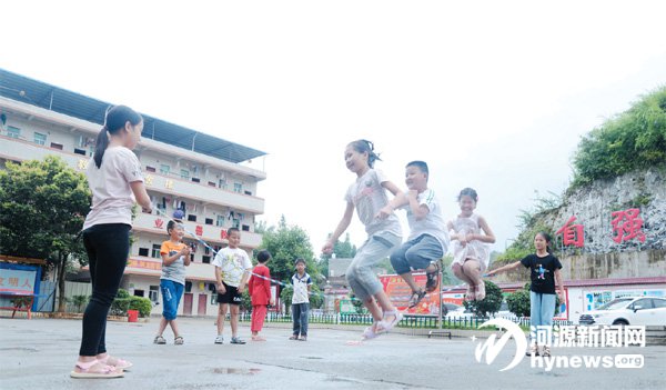 龍川縣貝嶺鎮,受災村莊里的孩子被安排到貝嶺鎮中心小學就讀。圖為孩子們在校園里跳繩。吳奕鎮 攝