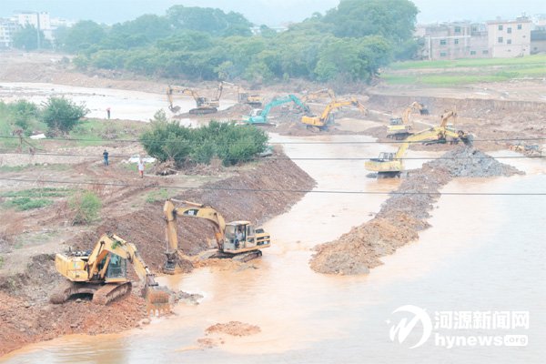 昨日,在連平縣上坪鎮新鎮村大席河段,省三防辦十多臺大型挖掘機正在疏通河道,重建河堤。此外,這些大型機械還會對河堤兩岸受災桃林里的垃圾進行清理。彭茂洋 吳文婷 攝
