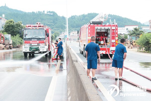 昨日,在連平縣上坪鎮105國道東陽村段,連平消防大隊官兵正在對道路進行沖洗。彭茂洋 吳文婷 攝