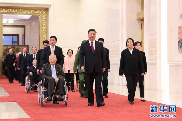 9月29日,中華人民共和國國家勛章和國家榮譽稱號頒授儀式在北京人民大會堂金色大廳隆重舉行。中共中央總書記、國家主席、中央軍委主席習近平同國家勛章和國家榮譽稱號獲得者一同步入會場。 新華社記者 丁海濤 攝