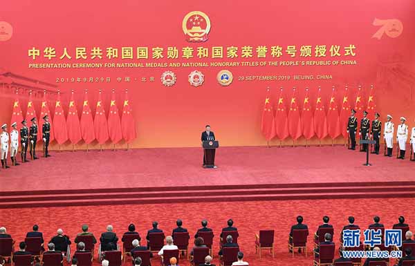 9月29日,中華人民共和國國家勛章和國家榮譽稱號頒授儀式在北京人民大會堂金色大廳隆重舉行。中共中央總書記、國家主席、中央軍委主席習近平向國家勛章和國家榮譽稱號獲得者頒授勛章獎章并發表重要講話。 新華社記者 黃敬文 攝