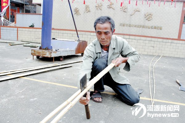 村民用刀具制作魚梁修復(fù)所用到的竹子。