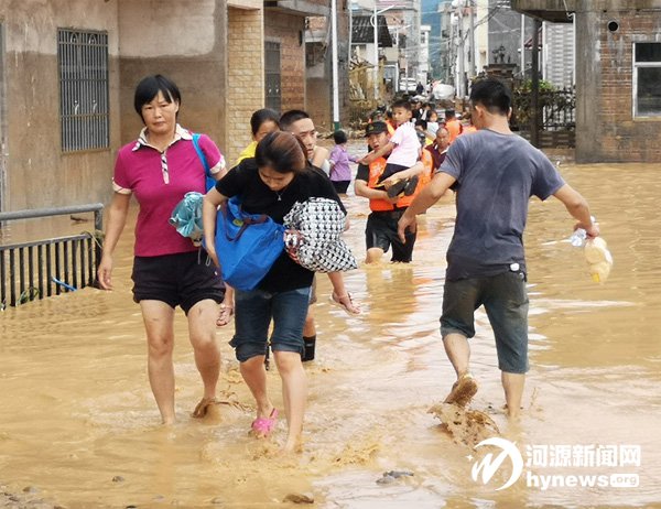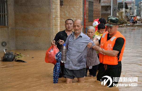 救援人員扶著被困群眾走出受災(zāi)點。