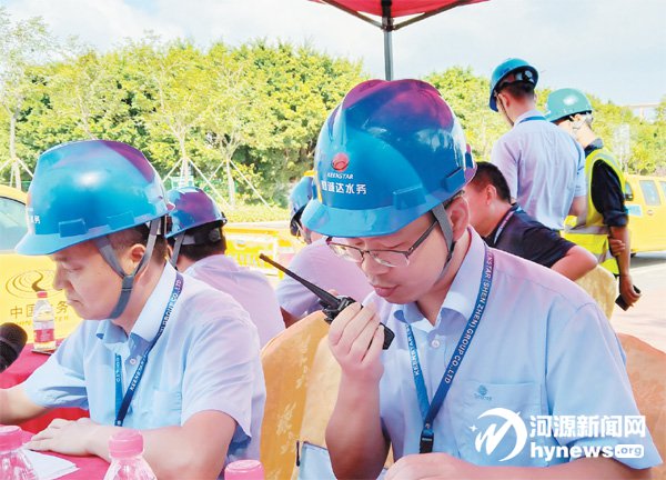 現場模擬市區供水應急調度,一是河源市水業集團有限公司青山水廠生產設備應急搶修,影響市水業集團公司供水區域居民供水安全問題,請求南水北調;二是河源市勤誠達水務有限公司三棵松水廠生產設備應急搶修,影響該公司供水區域居民供水安全問題,請求北水南調。信息收集、啟動應急預案、信息發布、應急處置……情景模擬作出決策、指揮、協同聯動處置,最終通過供水調度,有效解決了兩水廠供水區域居民供水安全問題。