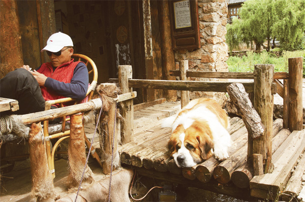 水流之處,有垂柳,有店鋪,有住房,有酒吧,有食肆,有藝人在自彈自唱著,聽上去像唱片般的音質,非常柔和悅耳;有店主與狗在嬉戲或休憩,一切顯得那樣地閑適和散漫。陽光亮亮地照著,透過樹陰漏下或圓或角的光斑,照在想得到和想不到的地方,仿佛凝固的時光和歲月。樹下有躺椅、坐椅或石凳,你可以隨便坐下或躺下,讓時間在這里休止,讓煩憂在這里消散。如果要發呆,我想,束河古鎮或許是個很好的選擇。