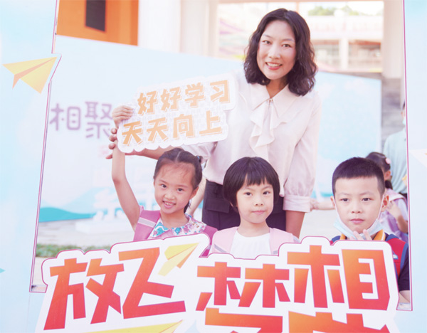 在深圳龍華紫金實驗學校,老師正在迎接新同學。