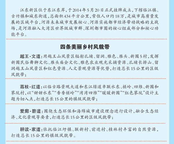 江東新區(qū)提出,必須堅持生態(tài)優(yōu)先,深入貫徹習(xí)近平生態(tài)文明思想,踐行“兩山”理念,大力發(fā)展綠色經(jīng)濟(jì),保護(hù)好江東新區(qū)的青山綠水,推動生態(tài)優(yōu)勢轉(zhuǎn)化成發(fā)展優(yōu)勢。今年,江東新區(qū)將全力實施鄉(xiāng)村振興行動,加快建設(shè)美麗幸福新村,探索山區(qū)村攜手奔共富密碼,將以推進(jìn)“越王·文道、荔枝·紅道、愛廊·碧道、耕讀·家道”四條15公里美麗鄉(xiāng)村風(fēng)貌帶建設(shè)為中心,深入推進(jìn)人居環(huán)境整治,持續(xù)改善農(nóng)村面貌;引導(dǎo)群眾加強(qiáng)荔枝、葡萄、雙坑土雞等特色農(nóng)產(chǎn)品和金絲皇菊、中草藥種植管理,打造高效益農(nóng)業(yè);開展鄉(xiāng)村振興重大項目招商推介活動,鼓勵社會資金參與鄉(xiāng)村振興,大力發(fā)展城郊型農(nóng)業(yè)。培育壯大農(nóng)業(yè)特色產(chǎn)業(yè)。充分利用臨江、古竹鎮(zhèn)現(xiàn)有特色產(chǎn)業(yè),采取“公司(合作社)+基地+農(nóng)戶”發(fā)展模式,推動農(nóng)村集體土地流轉(zhuǎn)改革,推廣集體土地入股模式,擴(kuò)大現(xiàn)代高效農(nóng)業(yè)種植面積6000畝,壯大村集體和村民經(jīng)濟(jì)收入。同時大力發(fā)展農(nóng)村電商、民宿、旅游等產(chǎn)業(yè),促進(jìn)三產(chǎn)融合發(fā)展。