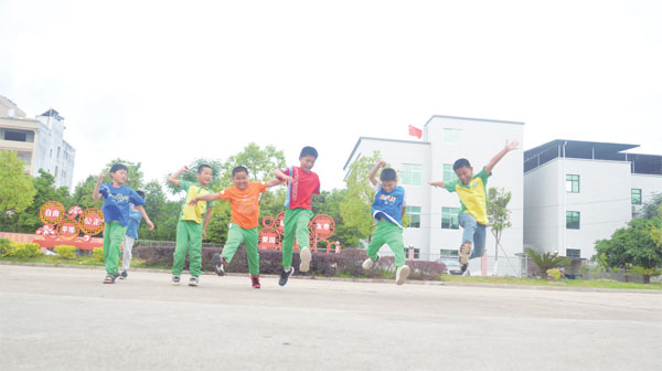 寬敞的校園里,一棟棟教學樓屹立在校園多個角落,教學樓側方新建的球場、塑膠跑道為校園增添了一處風景線。在教學樓的高處瞭望,遠處環繞著山,一邊的升旗臺上,五星紅旗正迎風飄揚……