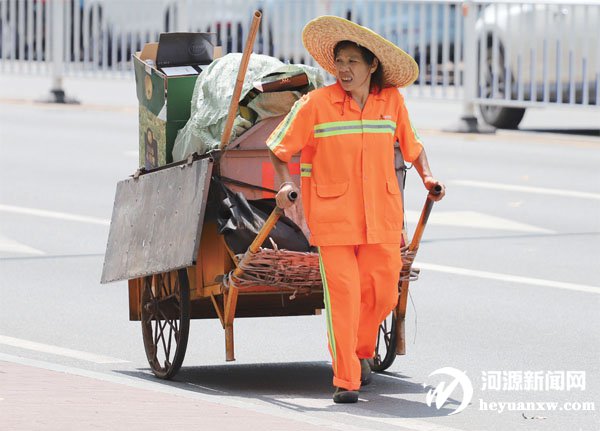 環(huán)衛(wèi)工人頭頂驕陽,清掃炙熱的路面、街道。