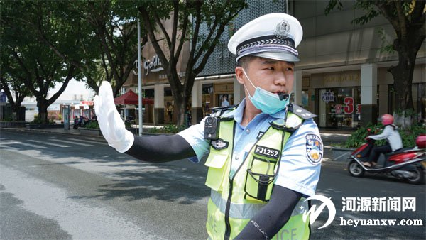 交警高溫下執(zhí)勤,維持市區(qū)交通秩序。