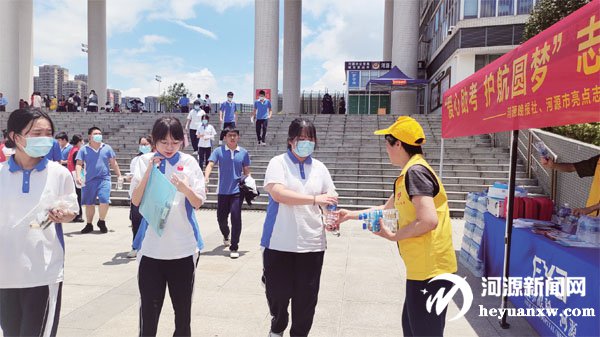 在河源中學、河源高級中學、源城區東埔中學考點外,由河源市亮點志愿者服務中心、河源市眾愛志愿者服務中心、河源市好人互助聯合會、河源市源城區退役軍人志愿者服務隊、河源愛爾眼科醫院及寶礦力水特等志愿團隊和愛心企業、單位組成的“高考愛心直通車”志愿者時刻守候在志愿服務點,隨時為考生和家長提供免費飲用水、扇子、防暑藥品等便民物資,緩解考生緊張的情緒,及時為需要幫助的考生伸出援助之手,讓考生們能安心應考。