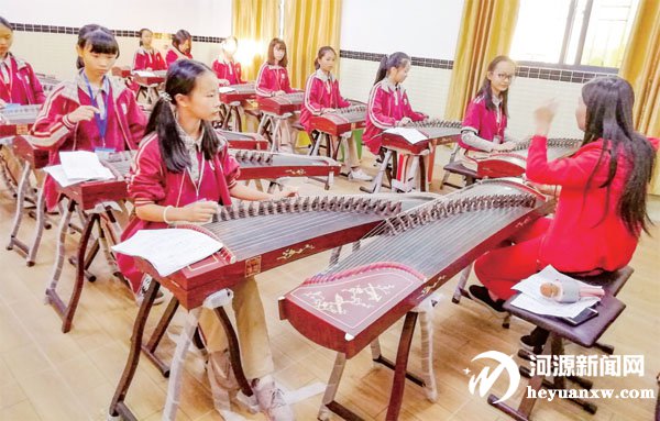 古箏興趣小組在老師的指導(dǎo)下練習(xí)彈古箏。