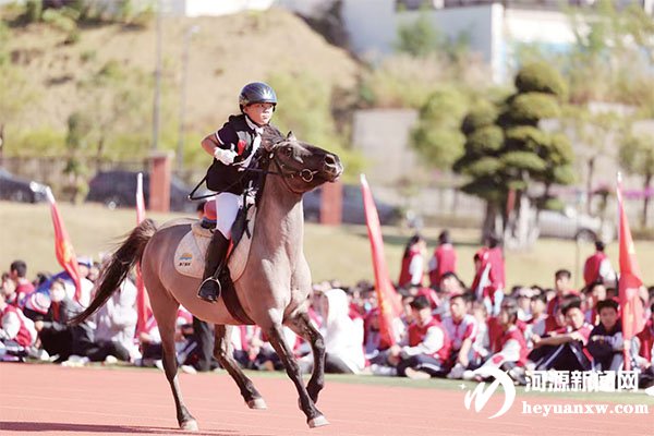 河源廣賦創新學校運動會,馬術隊隊員騎著駿馬亮相。