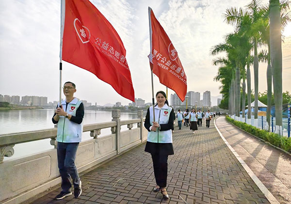 活動當天,郵儲銀行河源市分行員工穿上“郵愛公益”服飾,高舉公益協會志愿者旗幟,在河源市文化廣場以健步走的方式開展“3·20郵愛公益日”宣傳,向江邊街道商戶及徒步市民講解郵愛公益精神,積極號召社會愛心人士踴躍捐款,呼吁大家參與郵愛公益活動,為郵愛學子們的夢想加油。