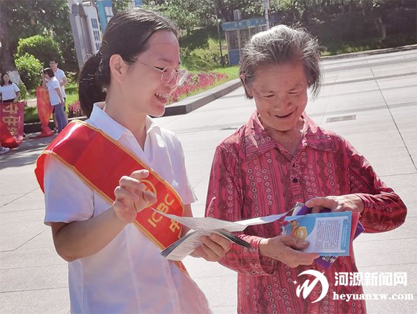 工行河源分行工作人員向群眾發(fā)放宣傳手冊。