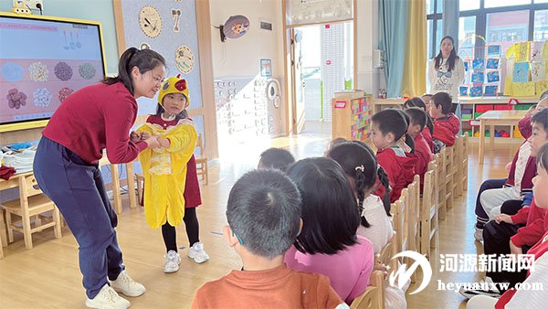 源城區東城幼兒園老師和幼兒正在開展節日主題的教育活動。
